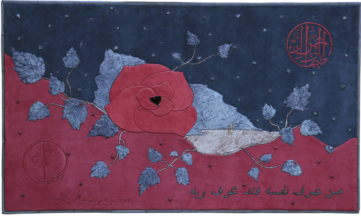 Ще один день догорає по дорозі в Мекку (пам'яті Муаммара Каддафі). Шкіра, турмалін, апатит, гранат. 42 x 71 см. |
