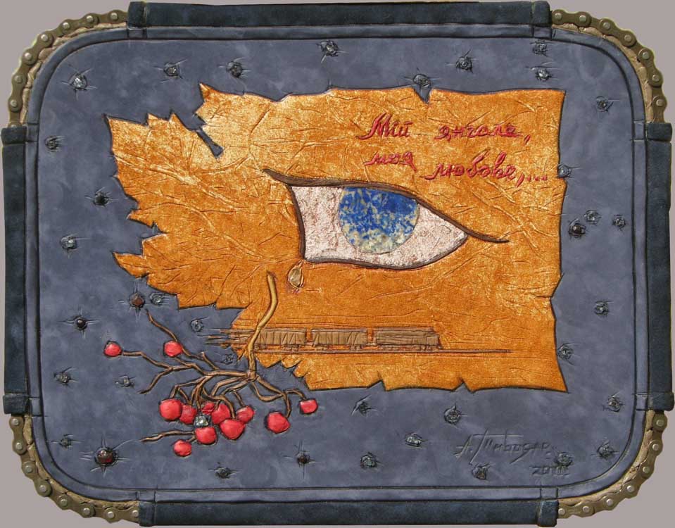 In memory of V. Stus. Leather, garnet, apatite, rock crystal, lazurite. 27 x 34.5 cm. |