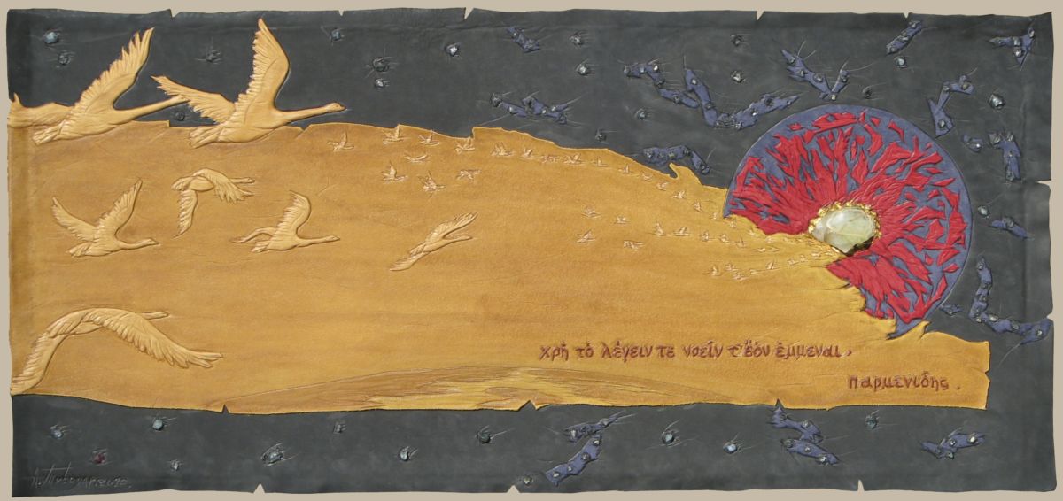 Leather, datolite, apatite, gold leaf.