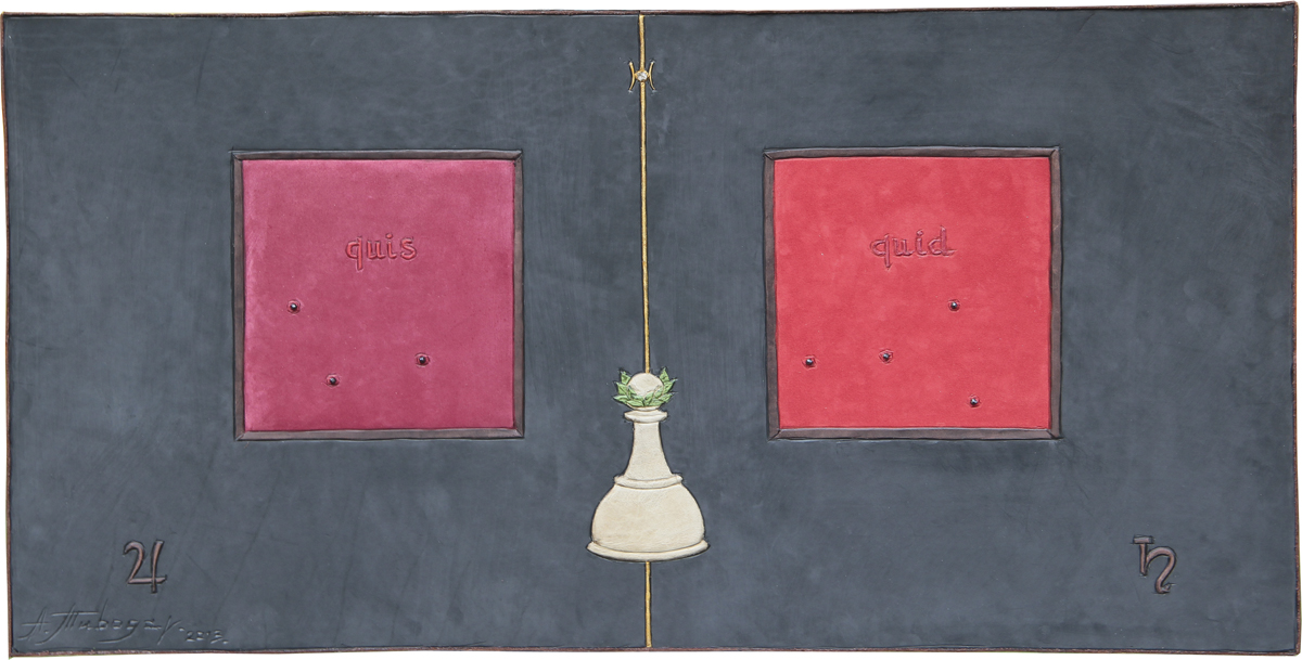 At the furnaces of Babylon. Leather, tinsel, gold leaf, garnet, rock-crystal. 40,5 x 80,5 cm. |