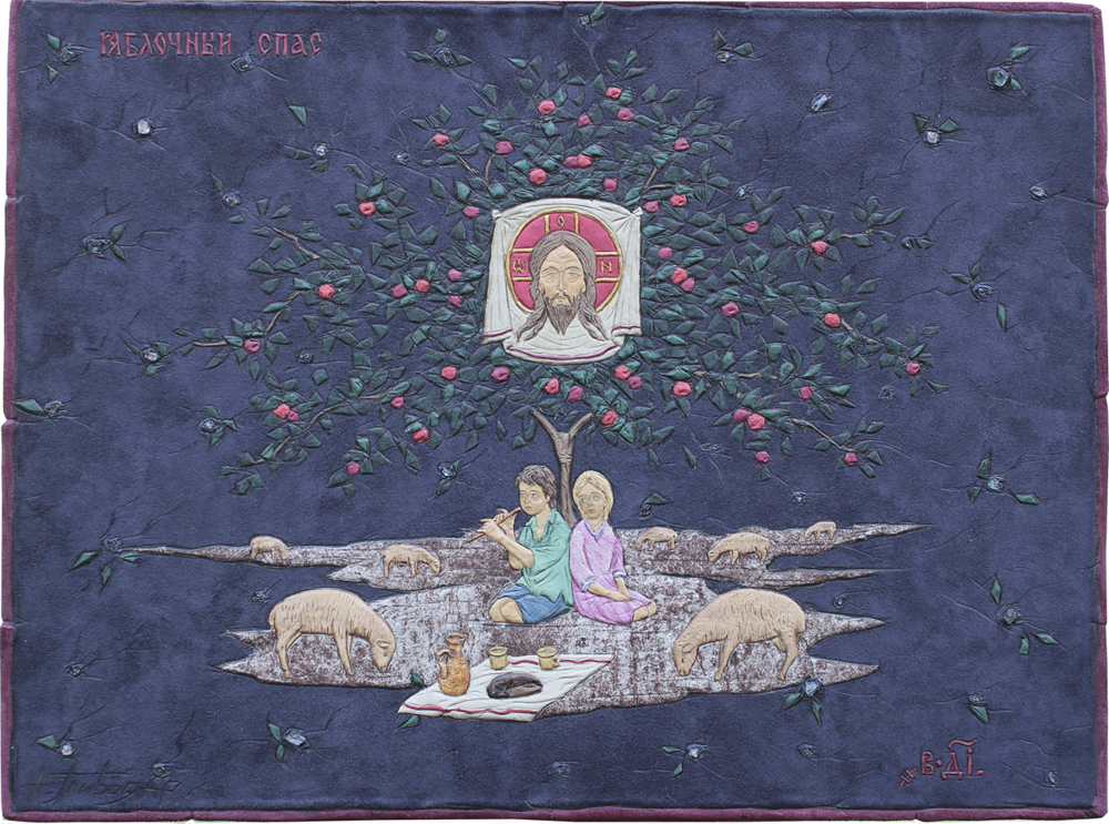 The Savior of the Apple Feast Day (to the memory of the children killed during the bombing in the east of Ukraine). Leather, apatite. 35 x 47 cm. |